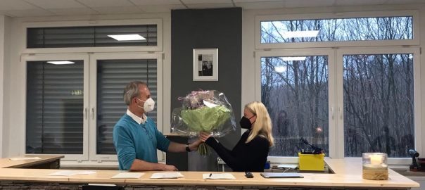 Nun ist es amtlich! Mit einem Blumenstrauß begrüßte Schuldirektor Christoph Henrichs am 29.01.2021 Svenja Otto als neue offizielle Konrektorin der Ganztagshauptschule Achenbach.