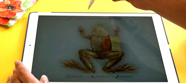 Sehr anschaulich demonstrierte Christina Sauer, Mitglied des Fördervereins und gleichzeitig Mitglied der Digitalisierungsgruppe, den Einsatz des Tablet-Koffers im Unterricht. Sie zeigte Beispiele aus dem DaZ-Unterricht mit Schreib- und Lernprogrammen zur Spacherlernung sowie Möglichkeiten des Einsatzes im Biologieunterricht. Mit Hilfe einer App sezierte sie einen Frosch oder mit Hilfe einer anderen App projezierte sie Organe in einen menschlichen Körper, der im realen Unterricht der Körper eines Schülers wäre. Der Einsatz dieser App im Unterricht hat bereits gezeigt, dass Schüler aufmerksamer mitarbeiten und sie die Lage der Organe im Körper besser behalten, wenn sie die Organe in ihrem eigenen Körper sehen (augmented reality). Eine weitere vorgeführte App, die kürzlich vom WDR in der Schule für den Geschichtsunterricht vorgestellt wurde, holte Zeitzeugen ins Klassenzimmer, die von KZ- und von Kriegserfahrungen berichten.